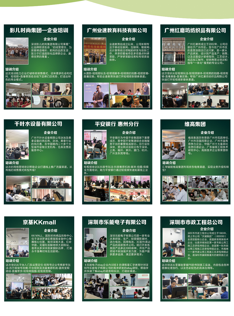 公司拥有一支由高学历、高素质人才组成的企业团队,都是有多年的电商行业经验和培训经验的师资团队,同时拥有丰富教育培训行业运营管理团队,形成了科学的管理体系。